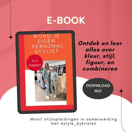 Het e-book "Word je eigen personal stylist in 4 stappen" is gecreƫerd door Claudia Switzer mode-expert die jarenlange ervaring heeft in de mode industrie en nu eigenaresse van Mooi! Stijlopleidingen en door Kirsten van @style_bykirsten. Bekende fashion influencer. bekend om haar shoplogs!